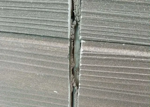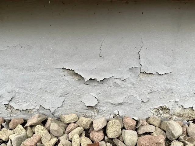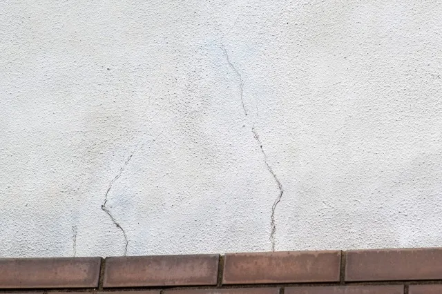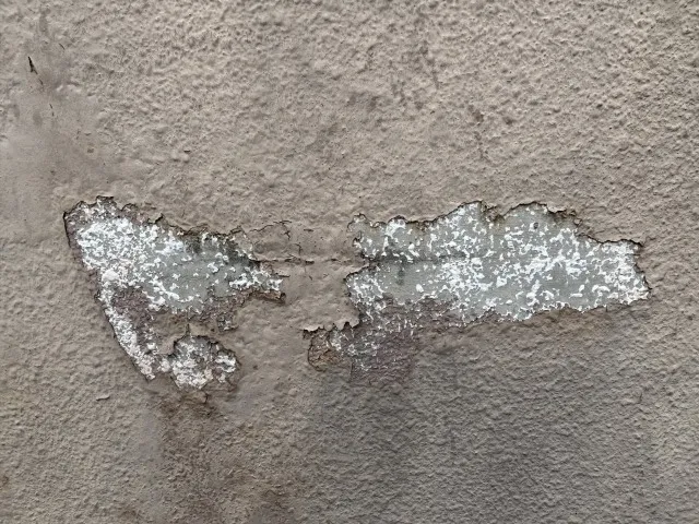 外壁に発生したひび割れから雨水が浸入し、塗膜の密着性が失われて剥がれてしまう症状です。ひび割れ自体が建物の構造的な問題を示すこともあるため、注意が必要です。塗膜がひび割れに追従できずに、そこから剥がれが広がるケースも多いです。